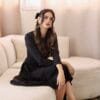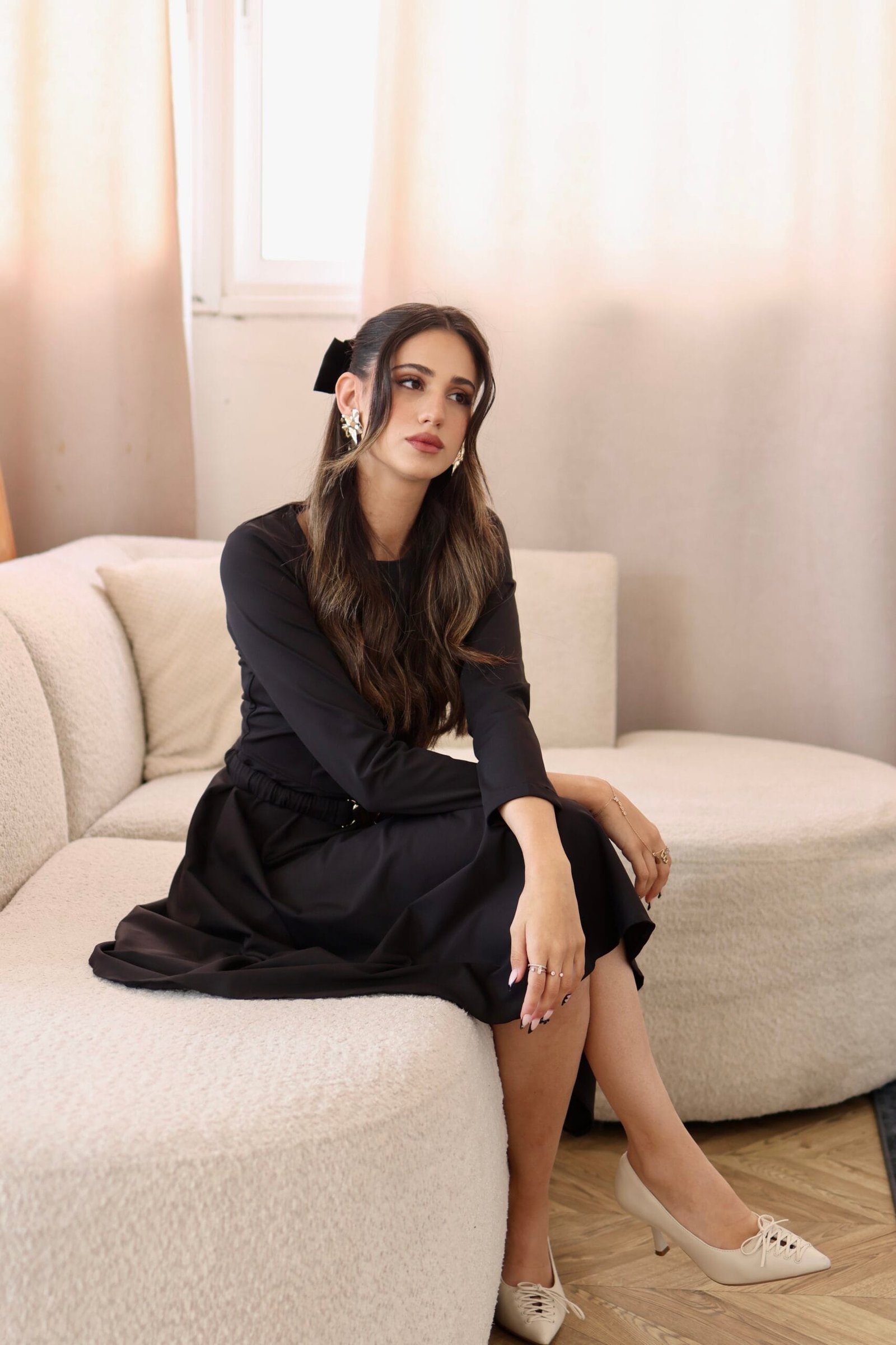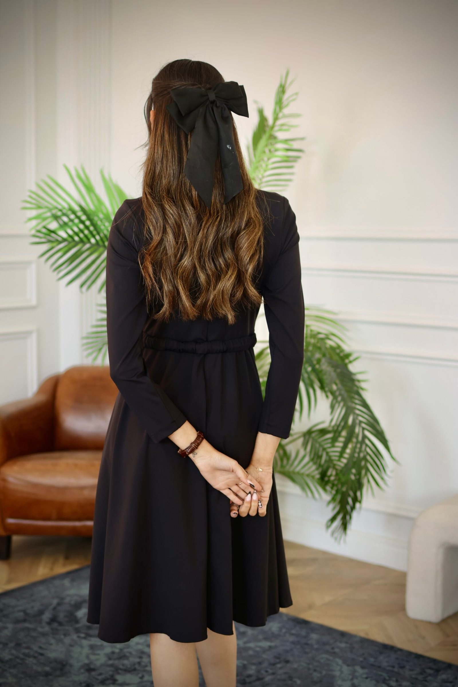 עיצוב נקי עם שרוולים ארוכים וחצאית נשפכת ליצירת מראה אלגנטי, צנוע ונוח – מושלם לאירועים וליום-יום.