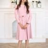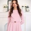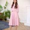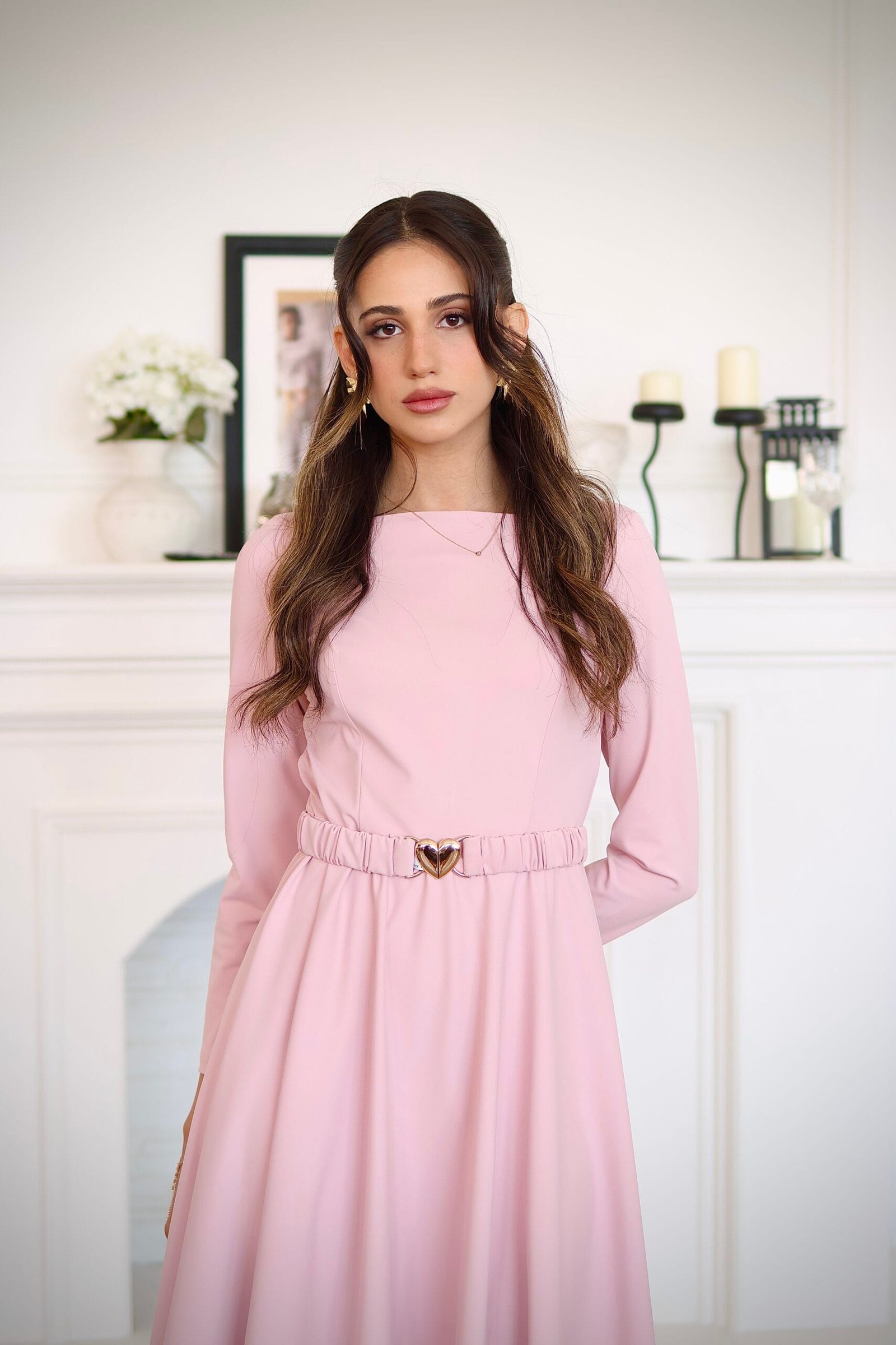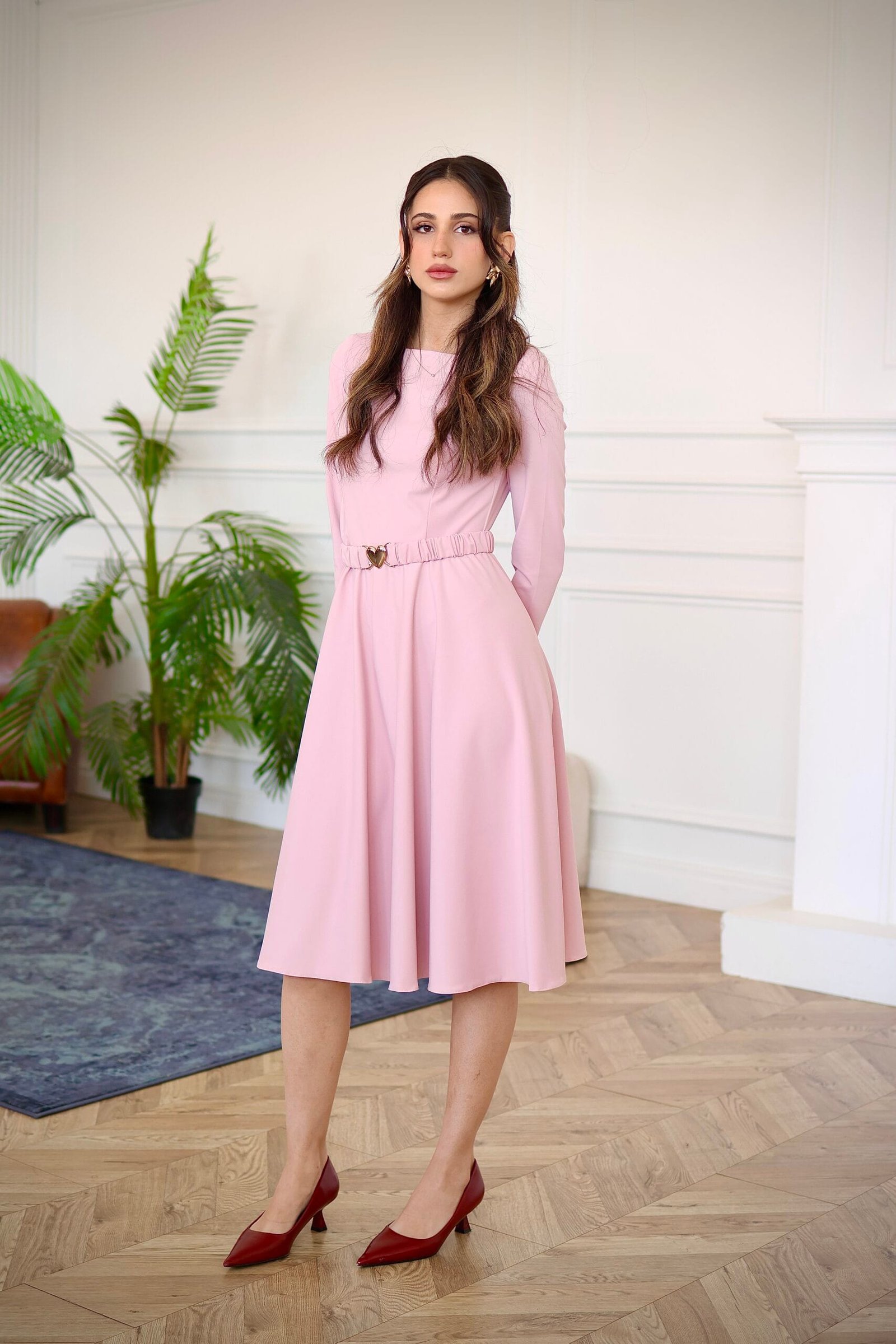 שמלת מידי בגזרה מחמיאה ונשית, עם חגורת מותן עדינה שמדגישה את הסילואט.
